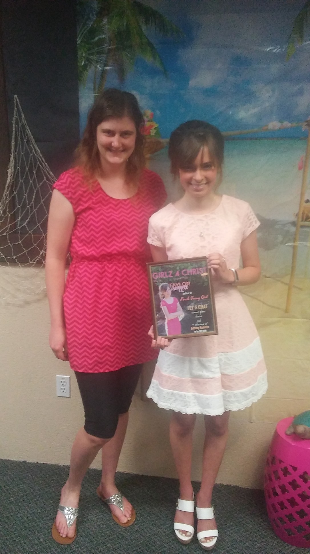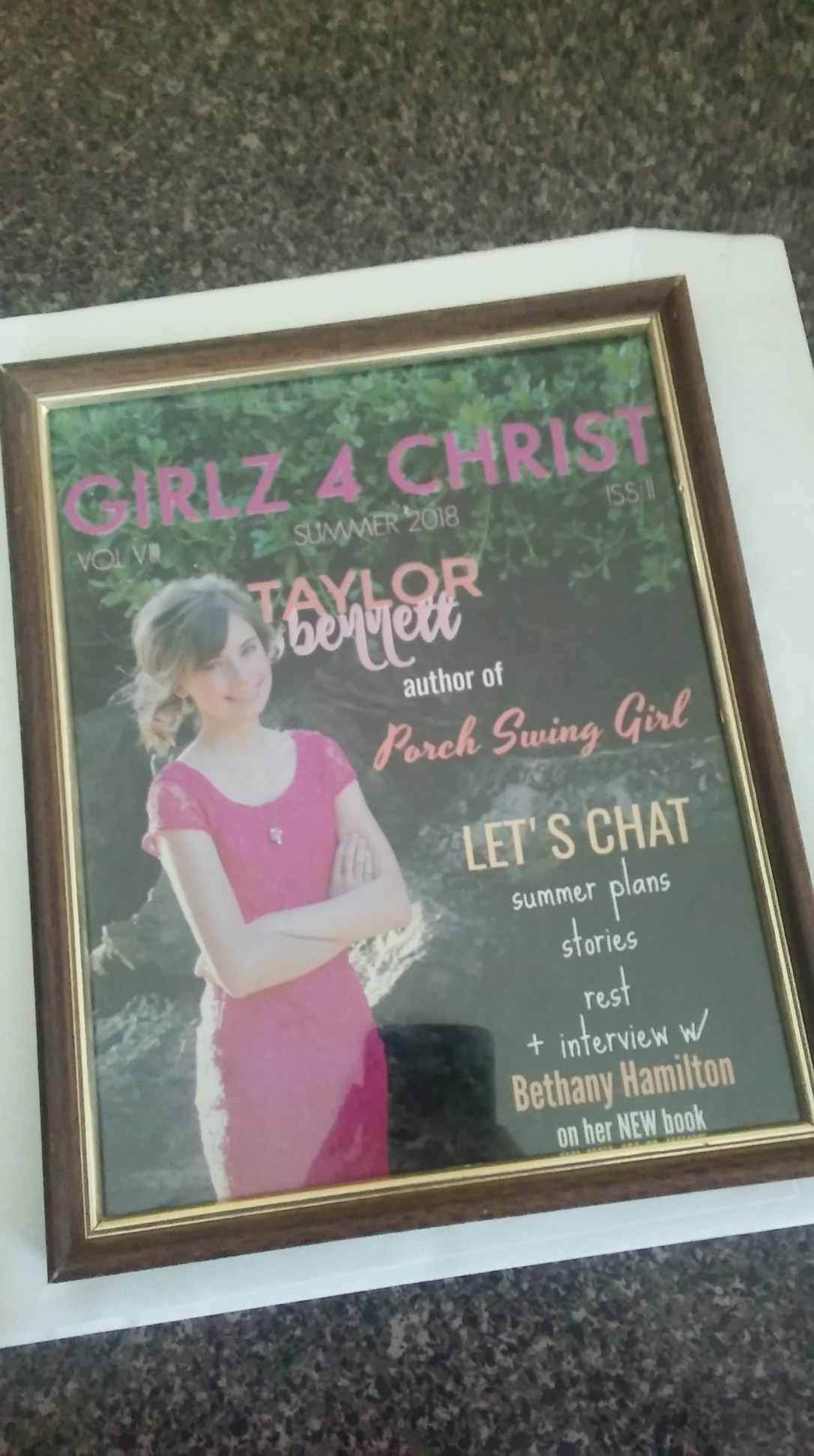 Upon arriving at Taylor’s church the day of her book release party, we enjoyed the Hawaiian decorations and food that matched the setting of Porch Swing Girl. Taylor Bennett was busy signing books for all the guests, but we did get the opportunity for a quick chat. I handed her an envelope, which when opened revealed a frame with the Girlz 4 Christ Summer 2018 cover.